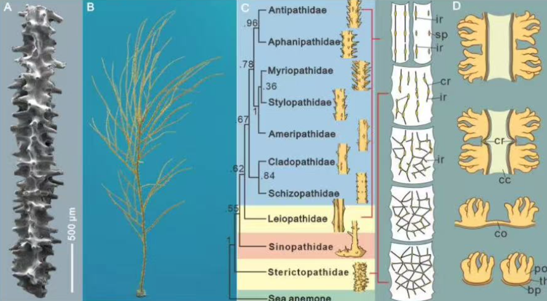 作为黑珊瑚目唯一的化石科,中华黑珊瑚科仅在我国湖北早奥陶世地层被发现。由于表面特征与现生黑珊瑚的差异巨大,其是否能够归属为黑珊瑚目,一直存在较大争议。“通过高分辨率显微CT技术,我们首次完整重建了黑珊瑚化石的三维内部结构,为确认其分类地位提供了关键证据。”beat365唯一官网博士生郝文静介绍,新发现的2个中奥陶世的黑珊瑚化石种,在演化上属于早奥陶世黑珊瑚化石与现代黑珊瑚之间的过渡形态类型,确认了硬黑珊瑚科属于黑珊瑚目。
