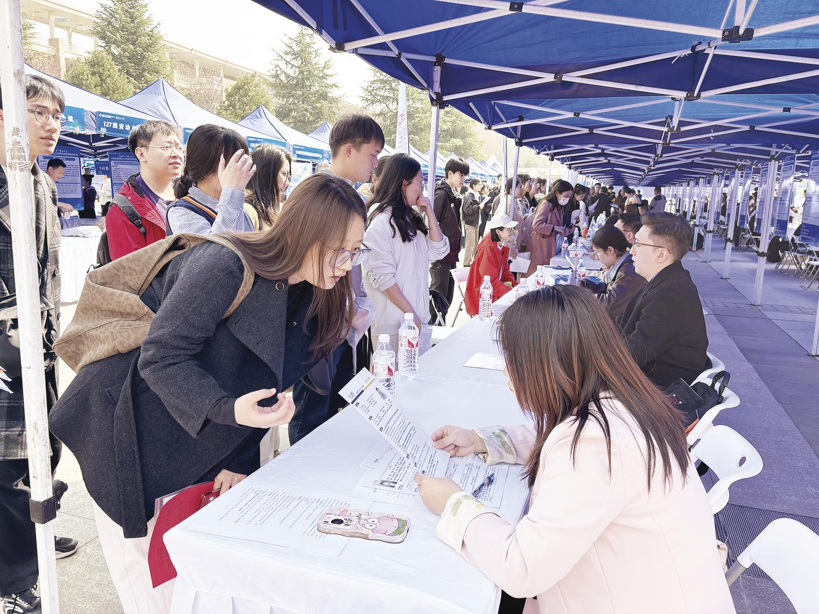 “我学的是英语语言文学专业,想找一份专业对口的工作,这是我的简历。”在一家培训机构招聘展位前,西安外国语大学学生李佳静小声说道。看得出来,第一次求职的她略显腼腆。