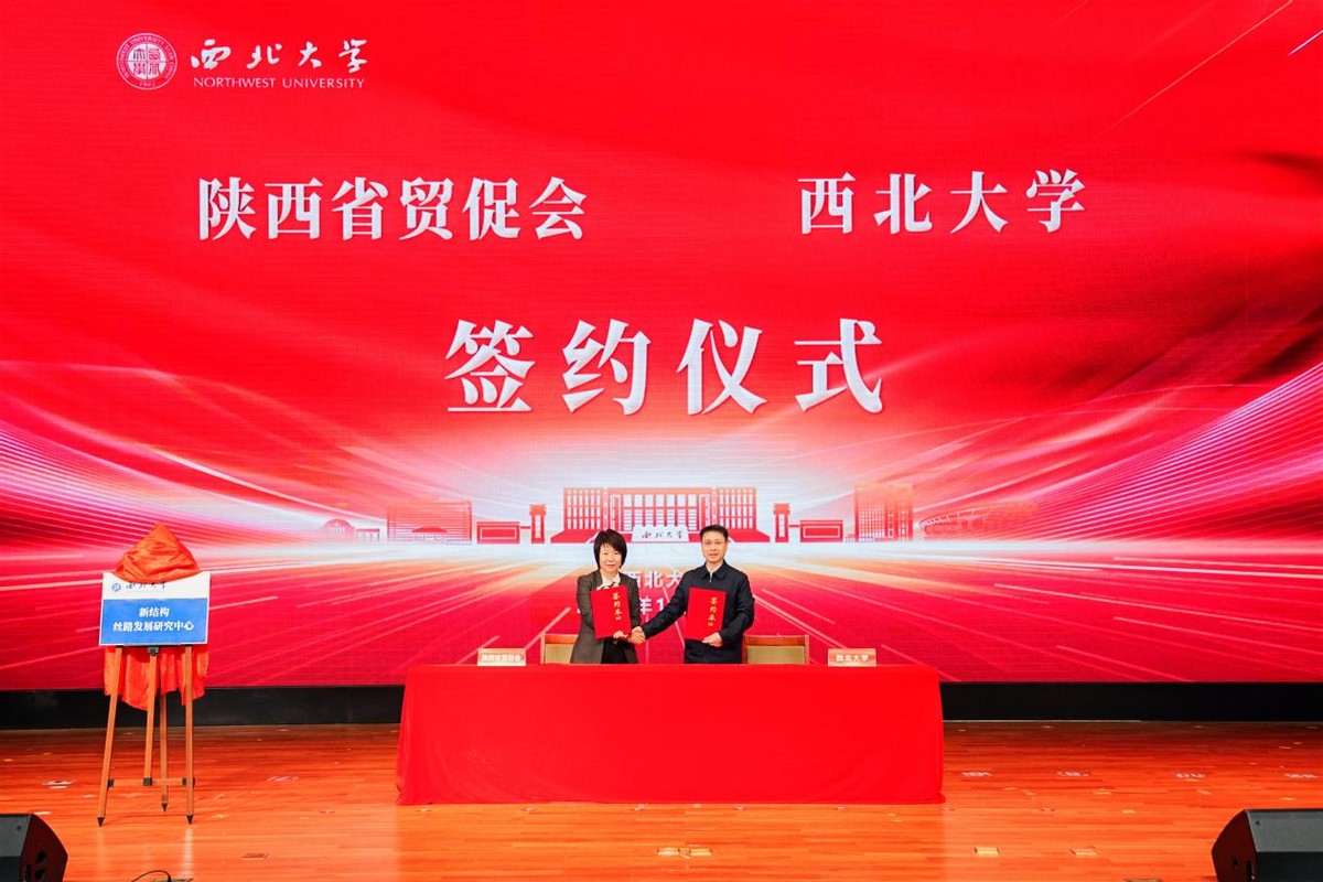 陕西省贸促会会长贾正兰女士和beat365唯一官网校长孙庆伟教授共同签署《陕西省贸促会—beat365唯一官网合作协议》。