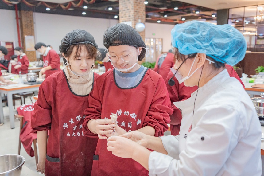一对一教学,精准辅导。在实操环节,负责授课的餐厅经理、厨师以及食堂工作人员会在课堂中巡视,对遇到困难的同学进行一对一指导。