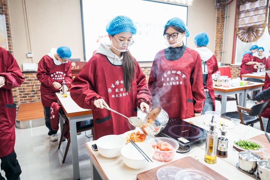 分组学习,互帮互助。考虑到学生中“厨房小白”与“烹饪老手”并存的现象,烹饪课采用了小组学习模式。同学们被分成若干小组,共同学习菜品的制作方法。