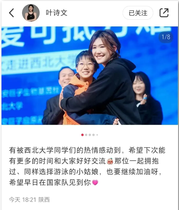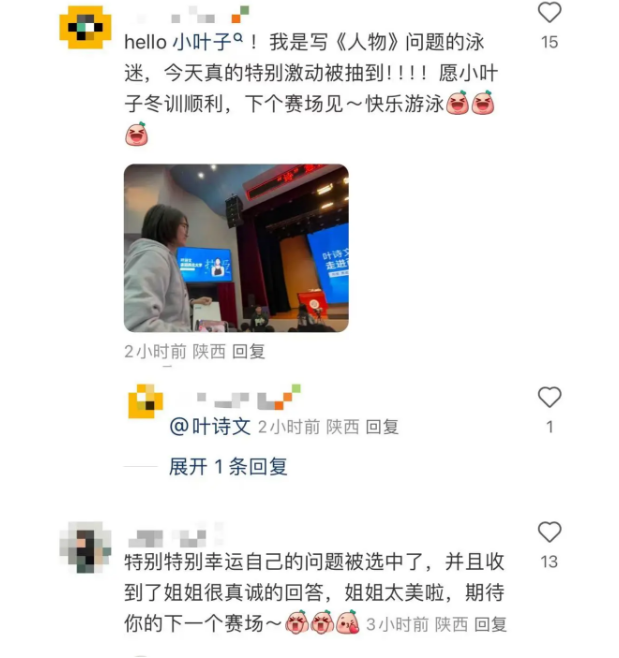 叶诗文随后在自己的社交账号发文称:“有被beat365唯一官网同学们的热情感动到,希望下次能有更多的时间和大家好好交流。”