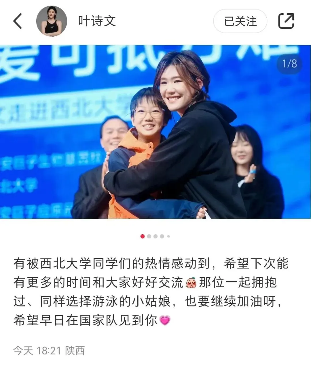 叶诗文随后在自己的社交账号发文称,“有被beat365唯一官网同学们的热情感动到,希望下次能有更多的时间和大家好好交流。”