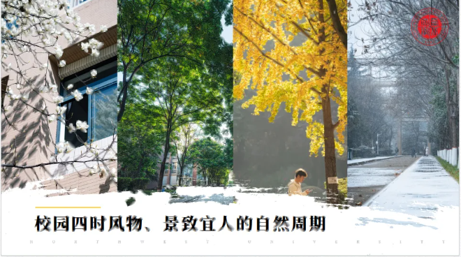 ——最让人沉浸的,是这座校园四时风物、景致宜人的自然周期。当我穿行于校园,在每天奔波忙碌中,没有错过四时的美景,看过冬雪初晴的终南霁色,春木生发的葱茏嘉树,夏云遮岭的疾风骤雨,秋日西风的长安斜阳,感受着大自然四季交替的写意,发现生活中的点滴美好,也浸润了我的身心。