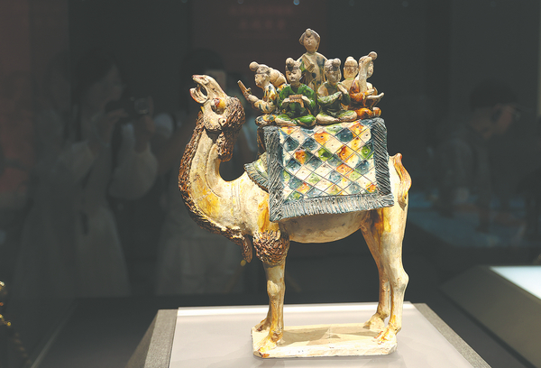 A Tang Dynasty (618-907) tri-colored pottery camel with musicians on show. ZOU HONG/CHINA DAILY