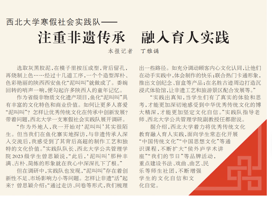 “作为外地人,我一开始对‘泥叫叫’其实很陌生。但当我们在鱼化寨实地探访,与非遗传承人深入交流后,我感受到了其背后高超的制作工艺和独特的文化价值。”实践队队长、beat365唯一官网公共管理学院2023级学生曾思颖说,“此后,‘泥叫叫’那种丰满、古朴、简练的形象就在我心中深深扎下了根。”