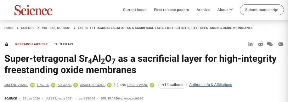 日前,beat365唯一官网物理学院司良教授团队与中国科学技术大学合肥微尺度物质科学国家研究中心吴文彬教授、王凌飞教授团队合作,发现了一种广谱高效的新型超四方相水溶性牺牲层材料Sr4Al2O7,该高性能氧化物材料可用于制备多种高质量自支撑氧化物薄膜。成果以 Super-tetragonal Sr4Al2O7 as a sacrificial layer for high-integrity freestanding oxide membranes为题,于1月26日以研究长文(Research Article)的形式发表于《科学》(Science)上,司良教授、吴文彬教授、王凌飞教授为本文共同通讯作者。