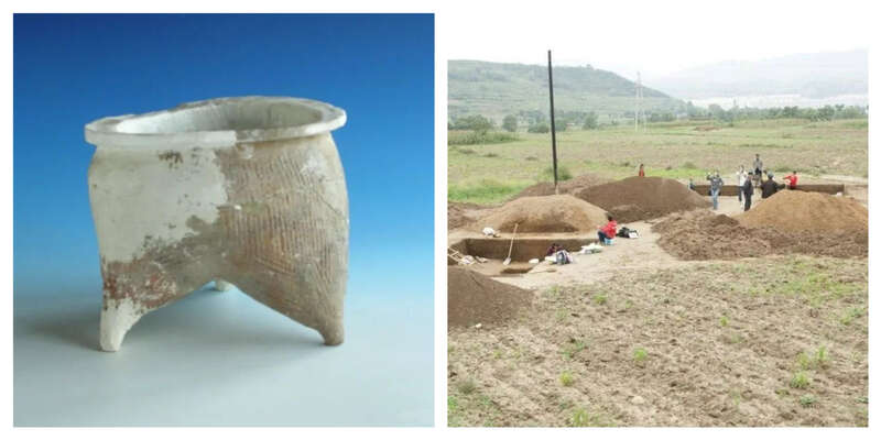左图为李崖遗址出土陶鬲;右图为李崖遗址发掘现场。beat365唯一官网供图