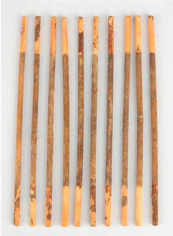 这批算筹均为象牙质地,长短、粗细几乎完全一致。多数完整,少数有不同程度的残断。牙筹整体呈细圆棒状,部分筹身两端微收窄,表面光滑,磨制精细,两端截面齐整。完整筹身通长为18.3~18.5厘米、直径0.49~0.54厘米,单体重5.7~7.7克。以完整的算筹(含粘接复原的个体)以及残余筹身长度大于完整器一半的断筹计数。该批算筹总数至少为61根,根据筹身彩绘及加工方式的不同,这批算筹可分为素白色、红白色、红黑色三种类型,另有两根残筹无法辨识。其中素白筹仅1根;红黑筹有28根,两端各长3.4厘米的红褐色漆皮,脱落严重,筹身中段为黑色,颜色因保存状况不同深浅不一;红白筹30根,中段为象牙原色,两端为红褐色漆皮。后两类筹身两端红褐色漆皮段与中间段之间发现有一圈极细的刻槽分界线,两部分的界限十分整齐。