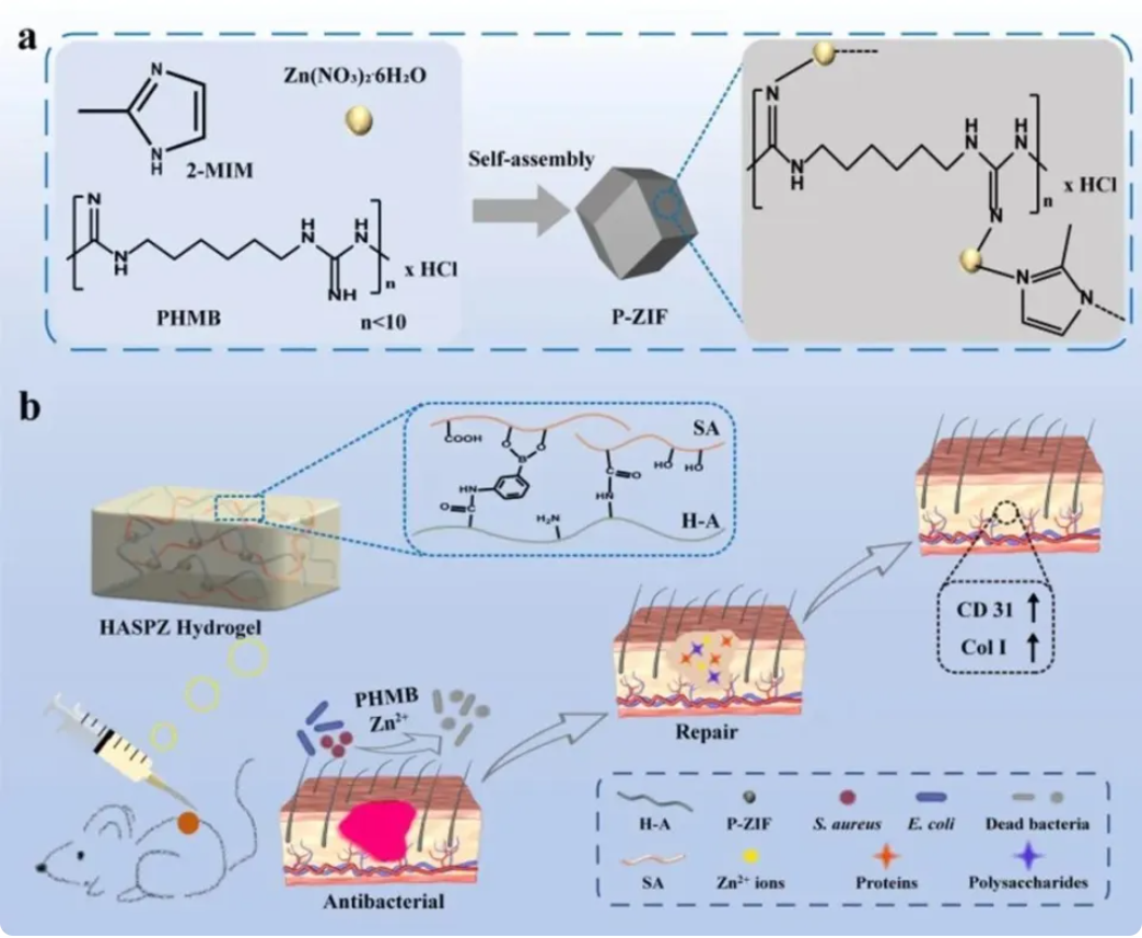 研究以ZIF-8为基础构建具有pH响应的P-ZIF抗菌纳米颗粒,并将其负载在由海藻酸钠(HA)和改性类人胶原蛋白组成的水凝胶中,设计出具有多重pH响应性的HASPZ抗菌水凝胶。当伤口感染后处于弱酸环境,水凝胶网络中硼酸酯键被打破,释放P-ZIF进行第一阶段杀菌解决轻度感染;当伤口受细菌的严重攻击时,P-ZIF中的PHMB被释放进行深层杀菌,解决伤口的严重感染。HASPZ水凝胶中Zn2+、多糖和蛋白质具有促血管生成和伤口愈合作用,在治疗烧伤方面表现出良好的疗效。