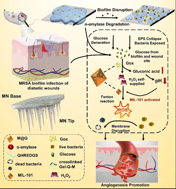 生物膜的存在及高血糖水平是慢糖尿病伤口愈合的主要障碍。团队首次将酶促生物膜破坏与基于GOx的化学动力学治疗(CDT)相结合,开发了一种多酶级联微针系统。该系统通过依次破坏生物膜、消耗葡萄糖和自供H2O2以产生ROS来根除耐药菌生物膜,降低葡萄糖浓度,同时减少细菌感染和炎症反应。总之,所构建的MN平台可以有效消除生物膜,减少炎症,促进糖尿病伤口修复。