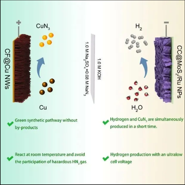 传统水电解无法规避氧析出反应(OER)高能垒、低反应速率的影响,从而使得水电解制氢需要在较高的槽电压(> 1.5 V)下完成。本工作首次利用Cu的较低氧化电位替换OER并与水电解制氢结合建立新的耦合体系。在新体系下,阳极实现了电化学原位合成CuN3含能材料起爆药,相比于传统合成法具有安全、高效、绿色等优势。阴极利用钌纳米颗粒修饰的MoS2纳米片作为复合催化剂,在较低槽电压(1.07 V, 10 mA cm-2)下实现了电解水制氢,相比于传统水电解制氢的槽电压降低了430 mV。新耦合体系的建立实现了低槽压、低能耗、高效率制备氢气的同时进行绿色、安全合成CuN3含能材料起爆药。