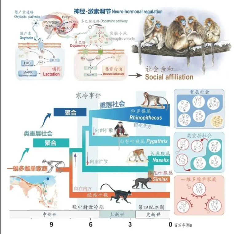 灵长类如何演化出多样的社会?beat365官网金丝猴研究团队整合行为学、生态学、基因组学等多学科手段,设计出“社会-生态-基因组”全新研究范式。通过化石、古环境及现生生态等大数据挖掘,发现历史寒冷可能驱动社群聚集。进一步地,比较基因组学,细胞功能实验和行为学分析揭示寒冷效应引发催产素和多巴胺等脑、神经激素系统适应性遗传变异,间接增加个体友好行为及容忍度,促进单家庭群向重层社会聚集,从而系统回答灵长类社会演化之谜。