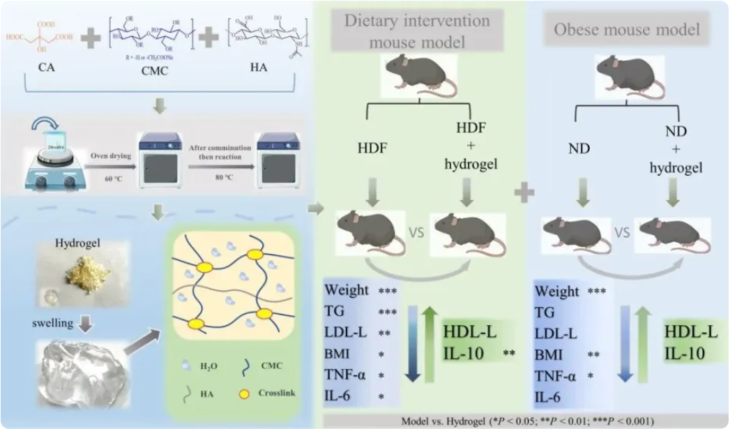 治疗时间长、手术风险高、药物副作用大,是影响肥胖治疗的主要因素。通过饮食干预预防或治疗肥胖已成为一种新兴的减肥方法。本研究采用廉价、安全的食品级原料,设计了两种高膨胀水凝胶。所制备的水凝胶具有高膨胀性、力学性能强、不易降解等特点。小动物活体成像实验表明,水凝胶主要存在于消化系统中。在饮食干预动物模型中,水凝胶有效地减缓了小鼠的体重增加,降低了肝脏脂肪积累、脂质水平和炎症反应。在治疗肥胖小鼠模型中,水凝胶减轻了肥胖小鼠的体重和肥胖相关症状。