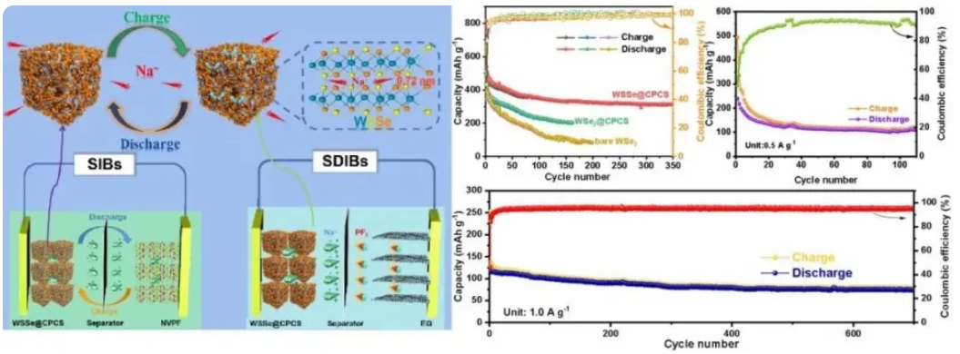 课题组研究开发了一种三维交叉网络碳骨架支撑的具有阴离子空位修饰的WSSe纳米片复合结构材料,通过硫原子掺杂所产生的阴离子空位大大提高了该复合材料的电子电导率;同时利用三维交叉网络碳骨架有效地缓解了充放电过程中钠离子扩散动力学缓慢和体积膨胀现象。该复合材料在钠离子半电池、全电池、钠基双离子电池中均表现出优异的储钠性能。