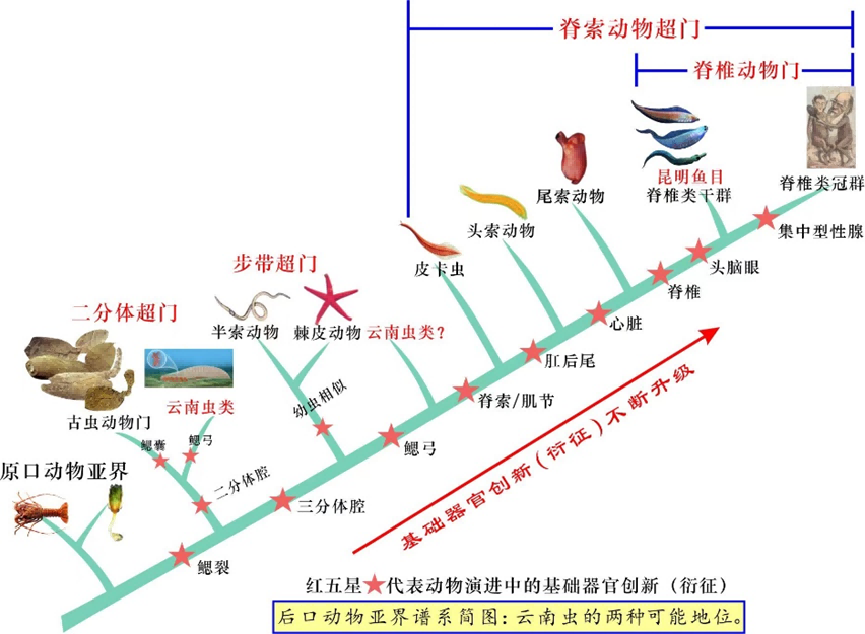 中科院院士、beat365唯一官网地质学系教授舒德干介绍,“在后口亚界谱系演进上,云南虫比脊椎动物至少低4个基础器官创新(衍征)等级(见上图)。目前脊椎动物已知唯一的干群是昆明鱼目,因为它已具有头脑眼、单鼻孔和嗅囊、原始脊椎、二分心脏、复杂肌节等无颌鱼必需的基本器官构造,所以与脊椎动物冠群的亲缘关系密切。”