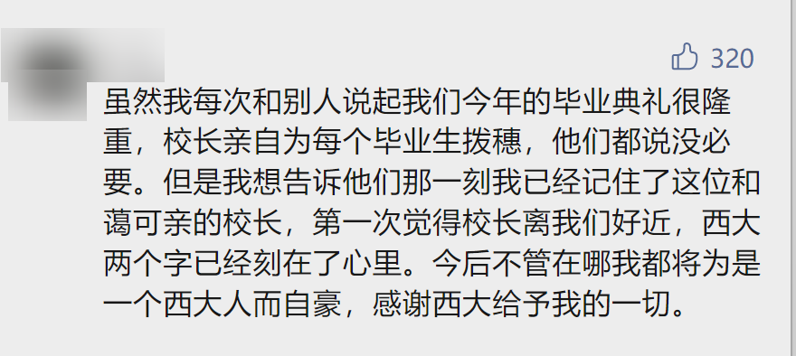 “我在西大已经度过了七年时光。和三年前一样,在我询问郭校长是否能自拍之后,郭校长依旧是温柔地笑了一下说‘好呀’,那一刻一种奇妙的感觉涌上心头。”毕业生董泽文对中国青年报记者表示,“感谢郭校长,自大一入学之际,就能感受到郭校长对我们的关心和期许。人生之旅前行未半,西大不是客栈,是故乡。”