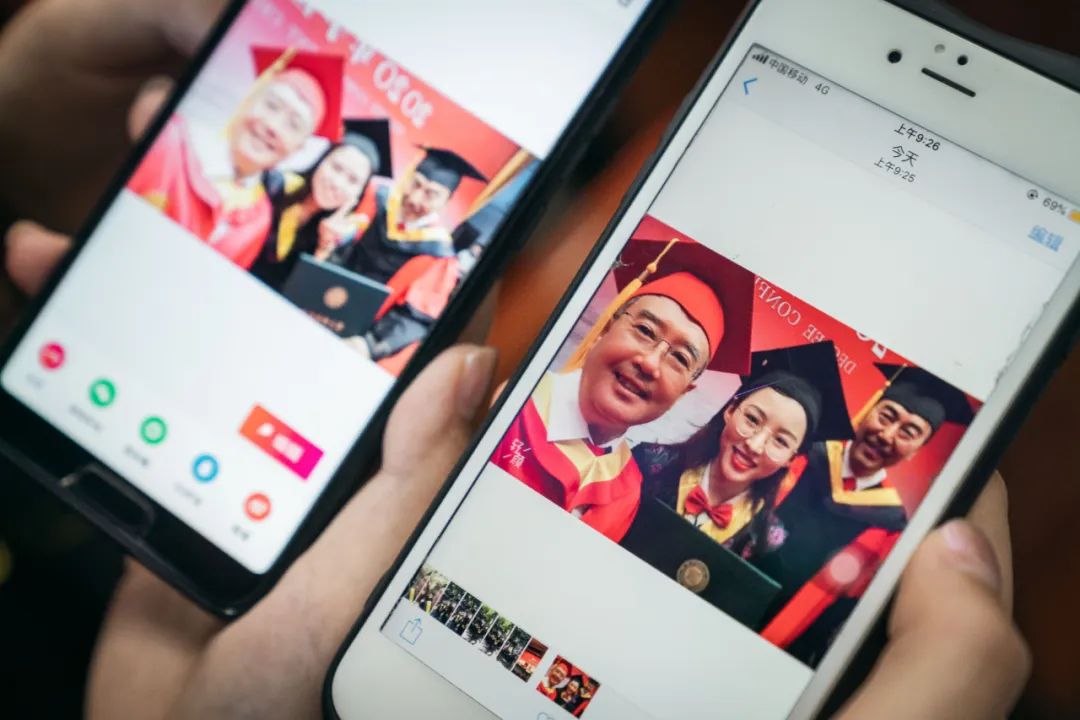 中国青年报记者注意到,今早,超过一半的毕业生在拨穗完成后还将自己的手机递给校长,由校长来操作手机进行自拍合影。