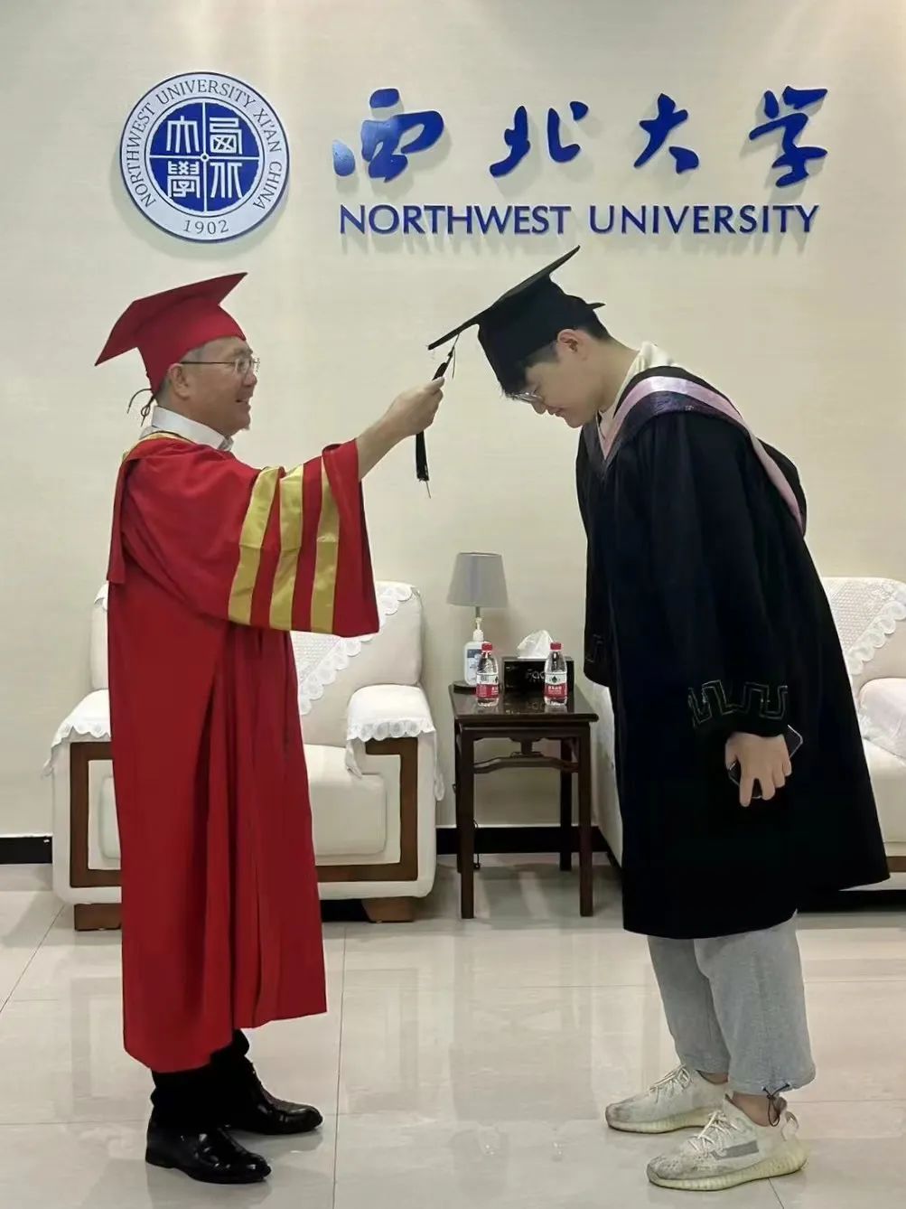 有两位毕业生,今天要去单位报到,赶不上今天的学位授予仪式。校长得知后,昨天给他们单独办“拨穗仪式”。