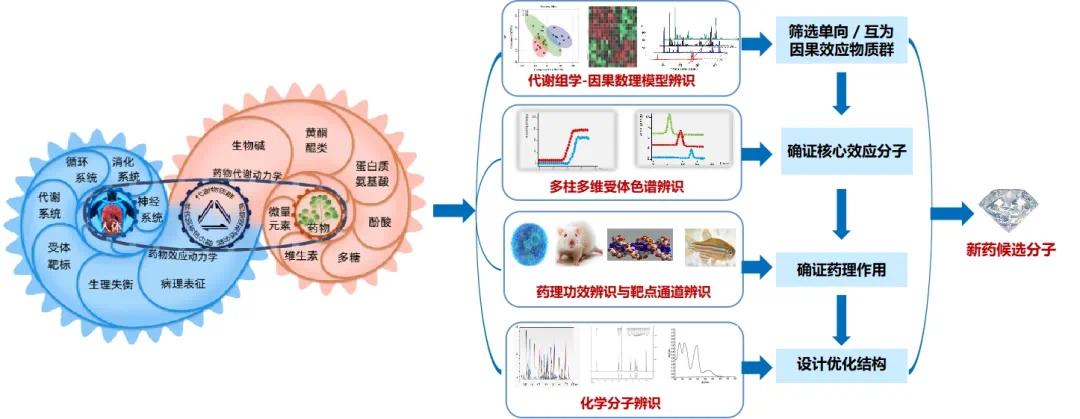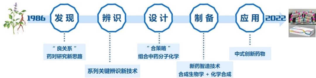 团队提出了“良关系”对药研究新思路,以揭示君使(臣)对药关系为突破口,纲举目张地阐明中药配伍机制,解决了中药复杂体系分析难的问题,探索了中药复杂体系研究的新模式。团队创建了集化学、数学、生物学、药学多学科技术的系列组合辨识技术,精准辨识药物-机体复杂系统中的核心效应分子,解决了中药复杂体系辨识难、周期长、准确率低的难题。团队提出创新药物分子设计“合策略”,遵循中药配伍机制,采用药物拼合手段设计多靶多效协同的全新分子,解决了新药分子设计受限于已知靶点、安全性低、失败率高的难题,提高了分子设计的目标性和可靠性。