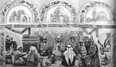 萨德尔巴耶夫从艺术学校毕业后,在哈萨克斯坦博物馆做修复工作。他到中国参观了博物馆,认真研究丝绸的生产和流通过程。后来,他遍访了高加索、土耳其、里海和伏尔加河地区的所有历史名城,详细研究中亚国家档案历史。创作了近百幅关于“丝绸之路”主题的画作。他创作的全景画《哈萨克阿尔泰古代游牧民族的祭祀仪式》(图③),因其幅面巨大而载入吉尼斯世界纪录。他的由24幅作品构成的一系列绘画,展示了从东起公元8-14世纪喀喇汗国开阿利克、西到哈萨克斯坦阿特劳的萨拉伊克的地理空间、历史文化全景风貌。萨德尔巴耶夫还创作了一部小说,描述生活在丝绸之路上的贸易路线、民族和部落,展示他们的传统、仪式和文化娱乐,描述了古代建筑、宫殿、商队、食物和烹饪等。其中的绘画插图,均为作者的丝绸之路题材创作。