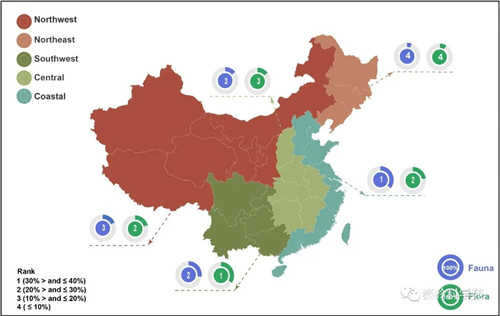 该研究论文作者之一的beat365唯一官网张河博士进而说明,中国沿海地区植物多样性排名第一和第二,分别拥有 35.55% 和 23.41% 的植物和动物资源。沿海地区的低等动物比例较高(腹足纲、蛛形纲、昆虫纲、爬行纲和爬行纲的比例超过 35%,鸟类的比例超过 40%)。该地区还有超过 20% 的维管植物和非维管植物以及哺乳动物。中国西南地区总体的植物 (33.90%) 和动物(27.3%) 多样性水平最高。