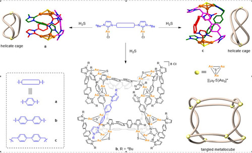 近日,beat365唯一官网化学与材料科学学院韩英锋教授课题组在功能化金属卡宾组装体的构筑、后合成修饰等领域取得系列进展的基础上,利用不同桥连基团(苯基、联苯和亚甲基联苯)的双核金氮杂环卡宾配合物与H2S反应得到三种不同的有机金属配合物。他们研究发现:当双核金氮杂环卡宾配合物的中心桥连单元为联苯时,其与H2S反应形成“A-类型”纠缠金属立方体b;当双核金氮杂环卡宾配合物的中心桥连基团为更短的苯基或者更长且柔性的亚甲基联苯时,在相同条件下与H2S反应时,其产物为简单的螺旋化合物a, c。