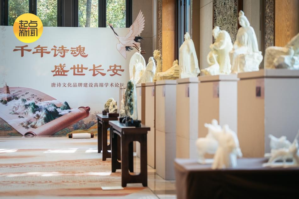 此外,三场平行论坛分别聚焦“唐代诗歌与唐代文化”“长安胜迹与唐代文化”“唐诗文化与文化创意、文化传播”。与会学者从文献考据、城市空间、数字化传播、文旅融合等多元维度展开讨论,构建起学术深度与应用广度并重的立体图景。论坛期间还设有唐诗主题视觉展陈,雕塑与玉雕作品让诗意在刻刀下凝固成可观的形象。当晚的唐诗词古谱音乐会,则以琴歌之声让诗篇穿越千年。
