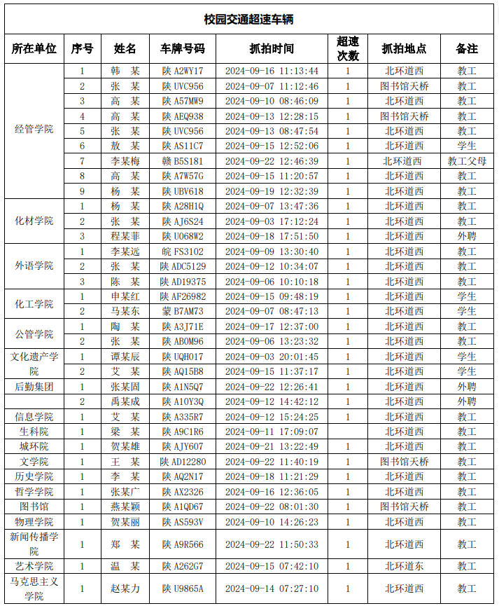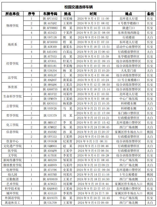 为一步加强校园交通管理,保障校园交通安全有序,维护学校正常的教学、科研和生活秩序以及师生员工的人身财产安全,根据《beat365唯一官网校园交通安全管理规定》有关要求, 现将2024年9月校园交通违章车辆予以曝光,具体情况如下表。