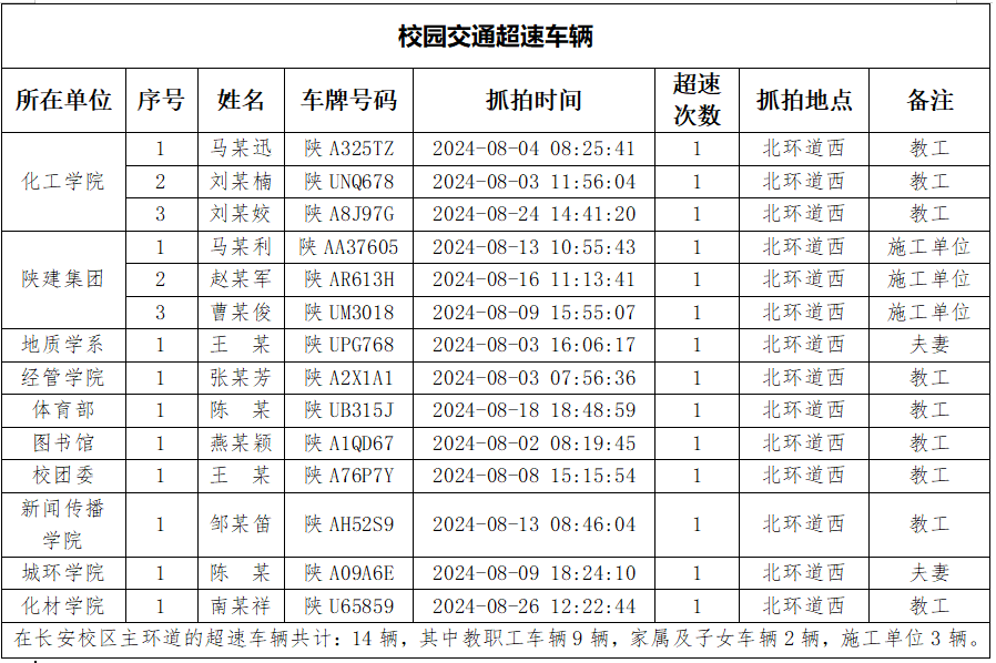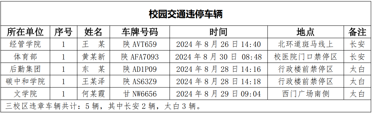 为一步加强校园交通管理,保障校园交通安全有序,维护学校正常的教学、科研和生活秩序以及师生员工的人身财产安全,根据《beat365唯一官网校园交通安全管理规定》有关要求, 现将2024年8月校园交通违章车辆予以曝光,具体情况如下表。
