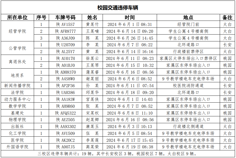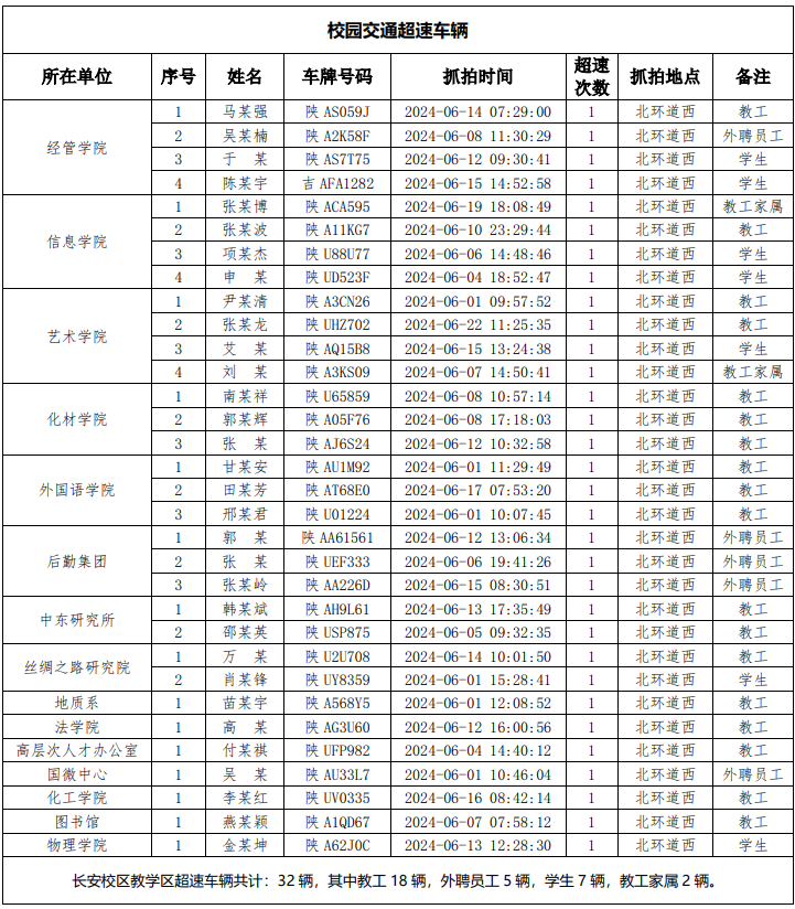 为加强校内道路交通安全管理,规范校内交通秩序,根据《beat365唯一官网校园道路交通管理办法》有关要求,现将2024年6月校园交通违章车辆予以曝光,所在单位负责对本单位违章师生员工进行交通安全教育和日常管理,对于校内曝光超速的学生车辆将取消下一年度的通行证办理资格。