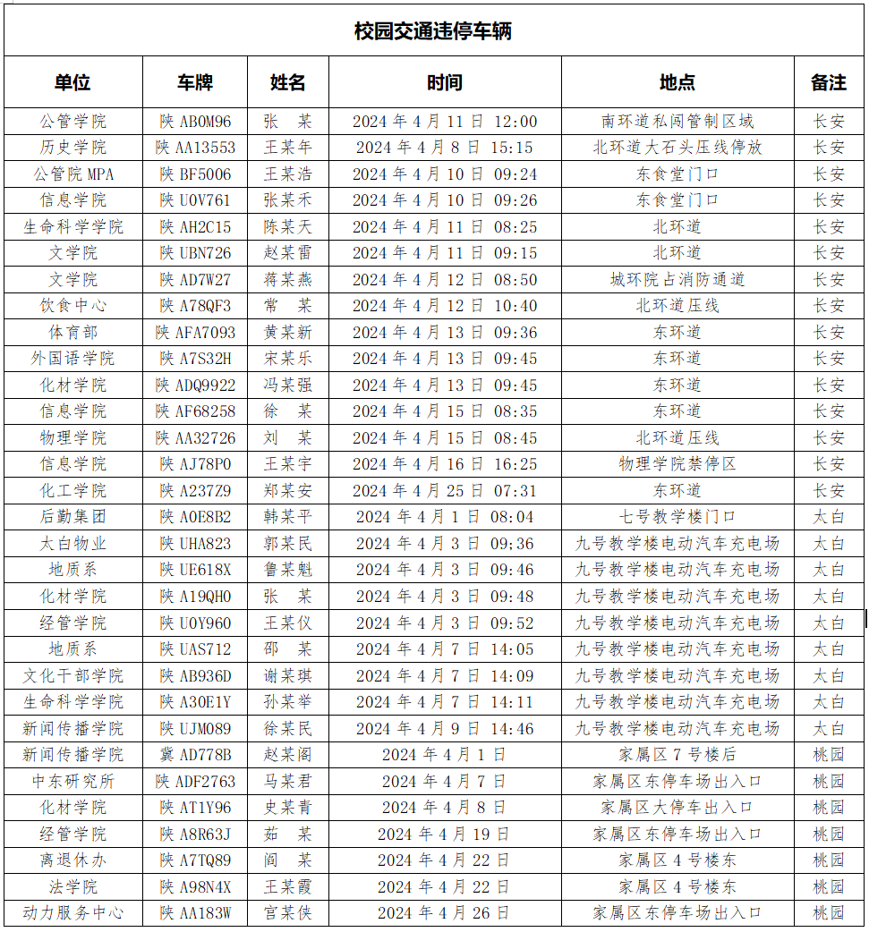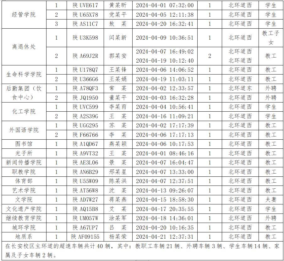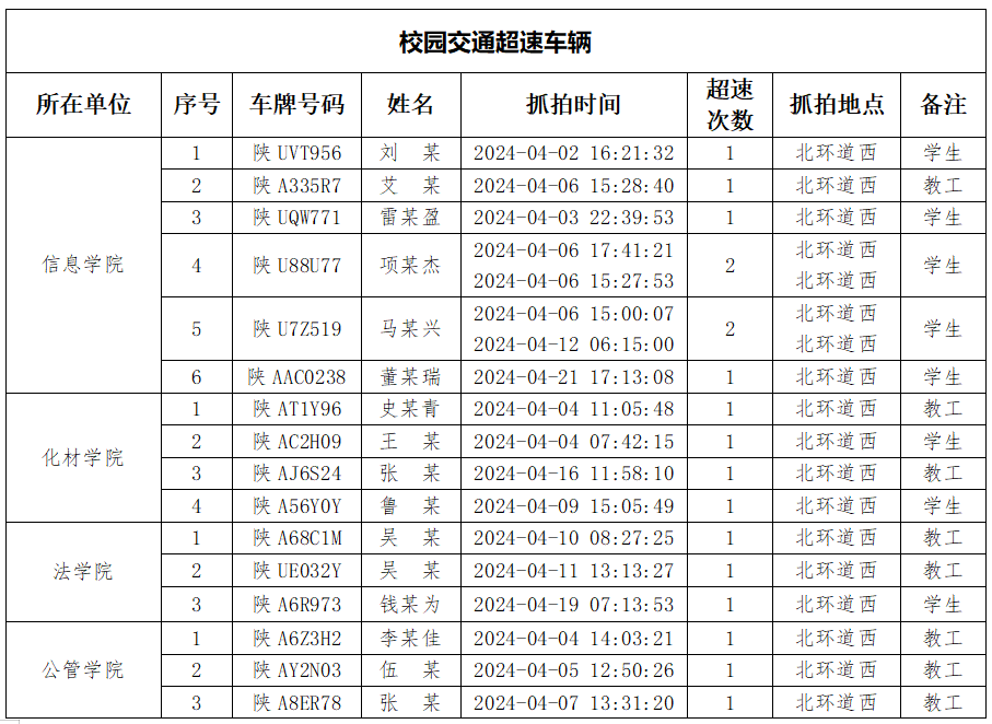 为加强校内道路交通安全管理,规范校内交通秩序,根据《beat365唯一官网校园道路交通管理办法》有关要求,现将2024年4月校园交通违章车辆予以曝光,4月份教工超速车辆占52%、学生超速车辆占35%、外聘职工及教工家属车辆占12%,请所在单位加强对本单位违章师生员工的教育和管理,对于校内曝光超速的学生车辆将取消下一年度的通行证办理资格。