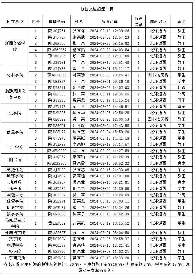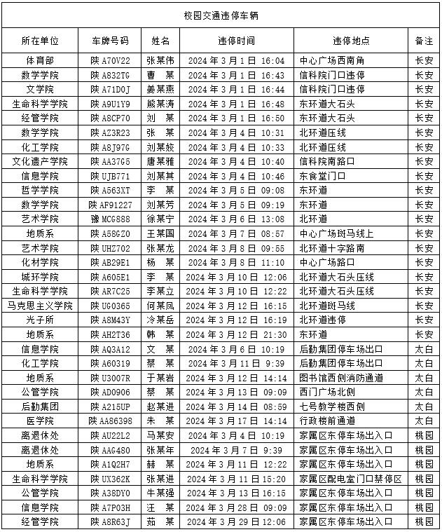 为加强校内道路交通安全管理,规范校内交通秩序,根据《beat365唯一官网校园道路交通管理办法》有关要求,现将2024年3月校园交通违章车辆予以曝光,所在单位负责对本单位违章师生员工进行交通安全教育和日常管理。