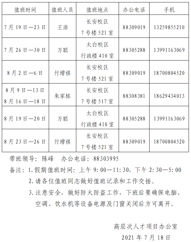 高层次人才项目办公室2021年暑假值班安排