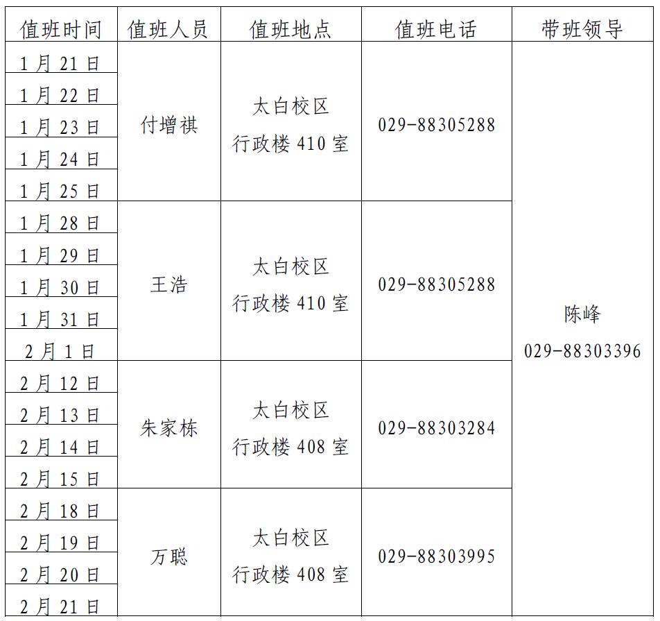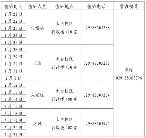 根据学校安排,高层次人才项目办公室寒假值班时间为每天上午9:00—11:30,下午14:30—17:00(周六、周日及2月4日至2月11日节假日休息),具体值班时间和地点如下,望广大师生周知。
