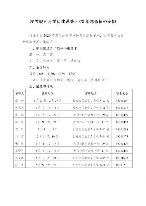 发展规划与学科建设处2020年寒假值班安排