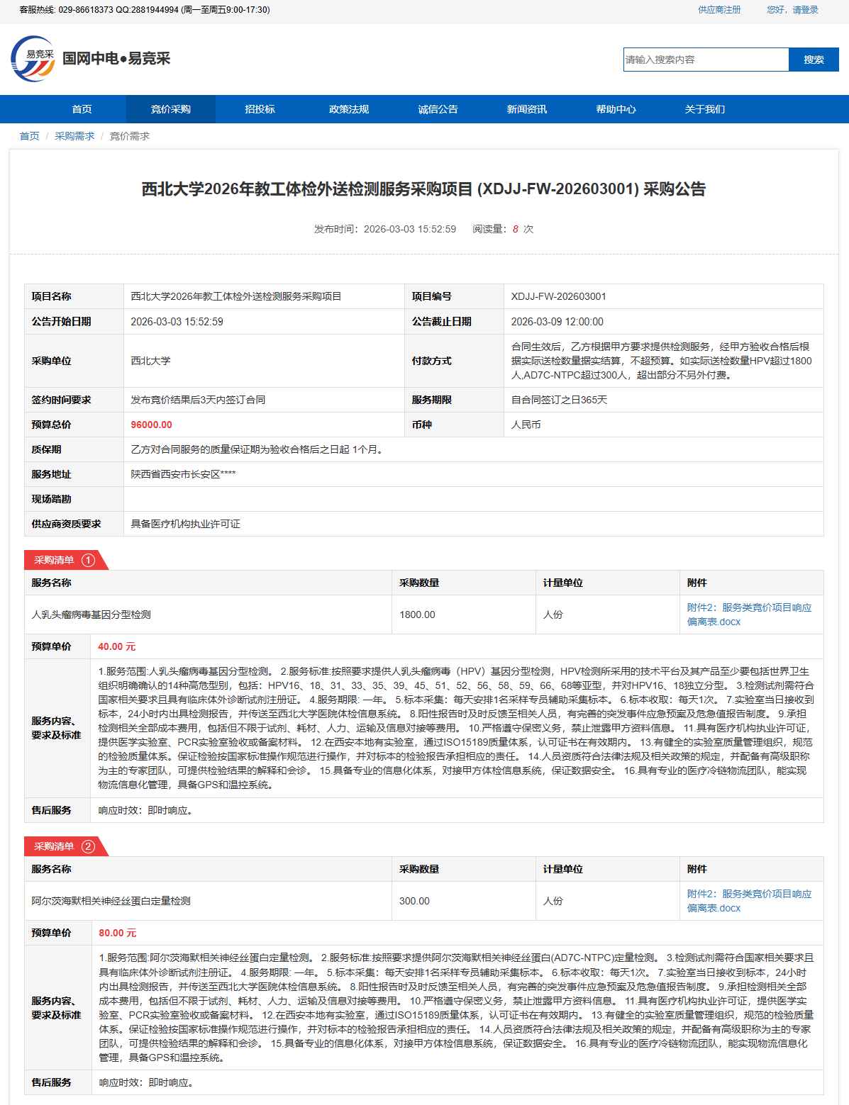beat365唯一官网2026年教工体检外送检测服务采购项目(XDJJ-FW-202603001)竞价采购公告