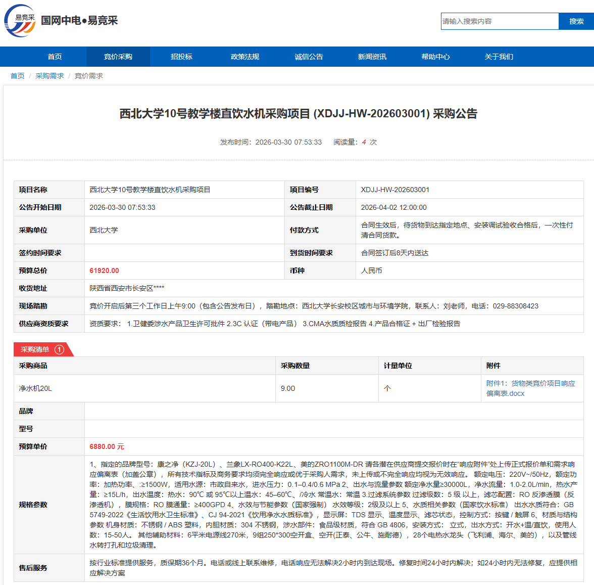 beat365唯一官网10号教学楼直饮水机采购项目(XDJJ-HW-202603001)竞价采购公告
