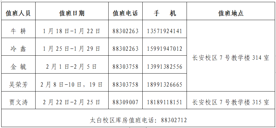 按照学校《关于2021年寒假放假的通知》安排和要求,现将我处寒假期间值班安排及联系方式公布如下: