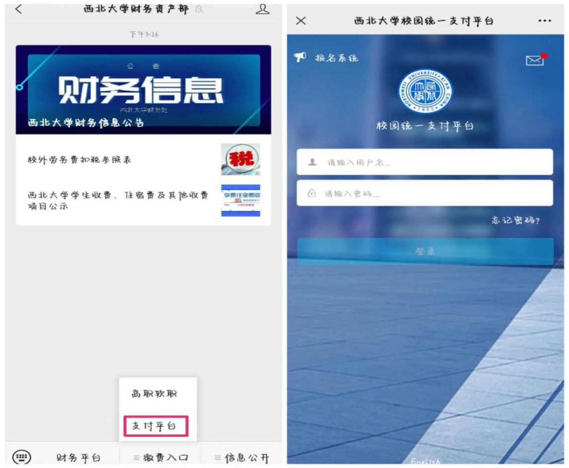 手机端:关注“beat365唯一官网财务资产部”微信公众号,选择“缴费入口”点击“支付平台”进入。(见下图)