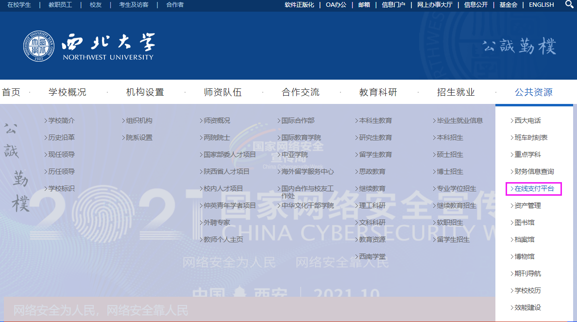 电脑端:登录学校官网首页,右上角选择“公共资源”频道,点击“在线支付平台”进入。(见下图)
