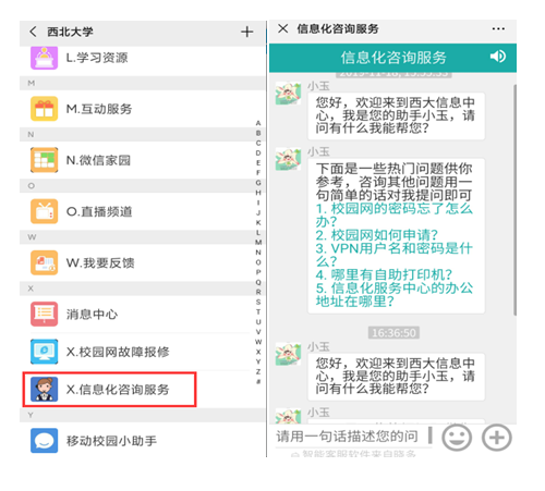 第二步:在“beat365唯一官网”微信企业号中点击“X.信息化咨询服务”,信息化智能客服小玉将为您解答信息化服务问题。