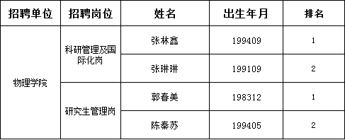 根据《beat365唯一官网物理学院公开招聘管理人员公告》的工作安排,经自主报名、资格审核、初试和复试环节,现将拟录用人员名单公示如下: