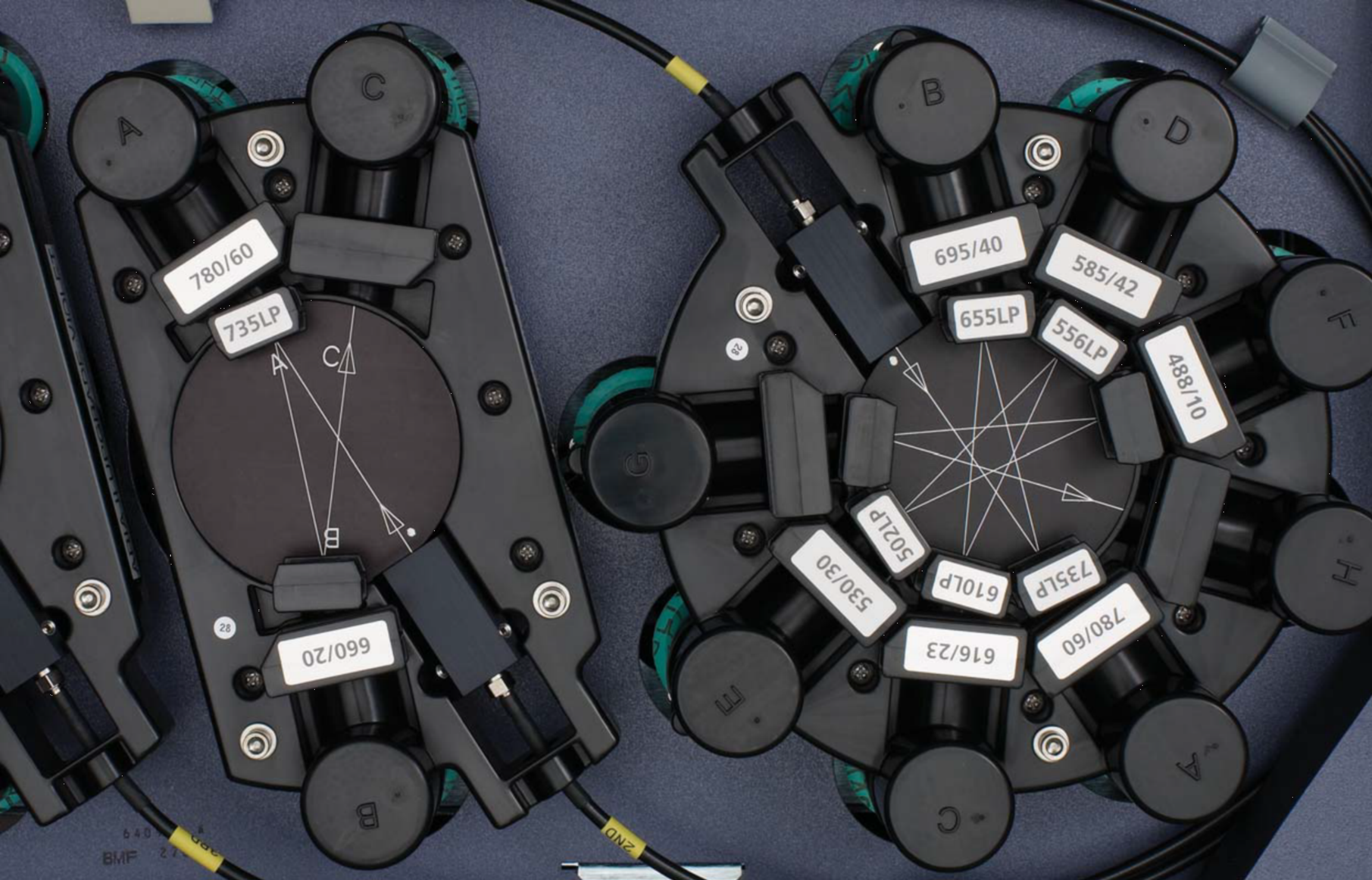 该收集系统能够最大限度的检测来自每个激光束照射点的信号,其原理是让最长是光优先投射进入第一个光电倍增管(PMT),并通过一系列长通二色分光镜将短波长的光反射到下一个PNT检测器。