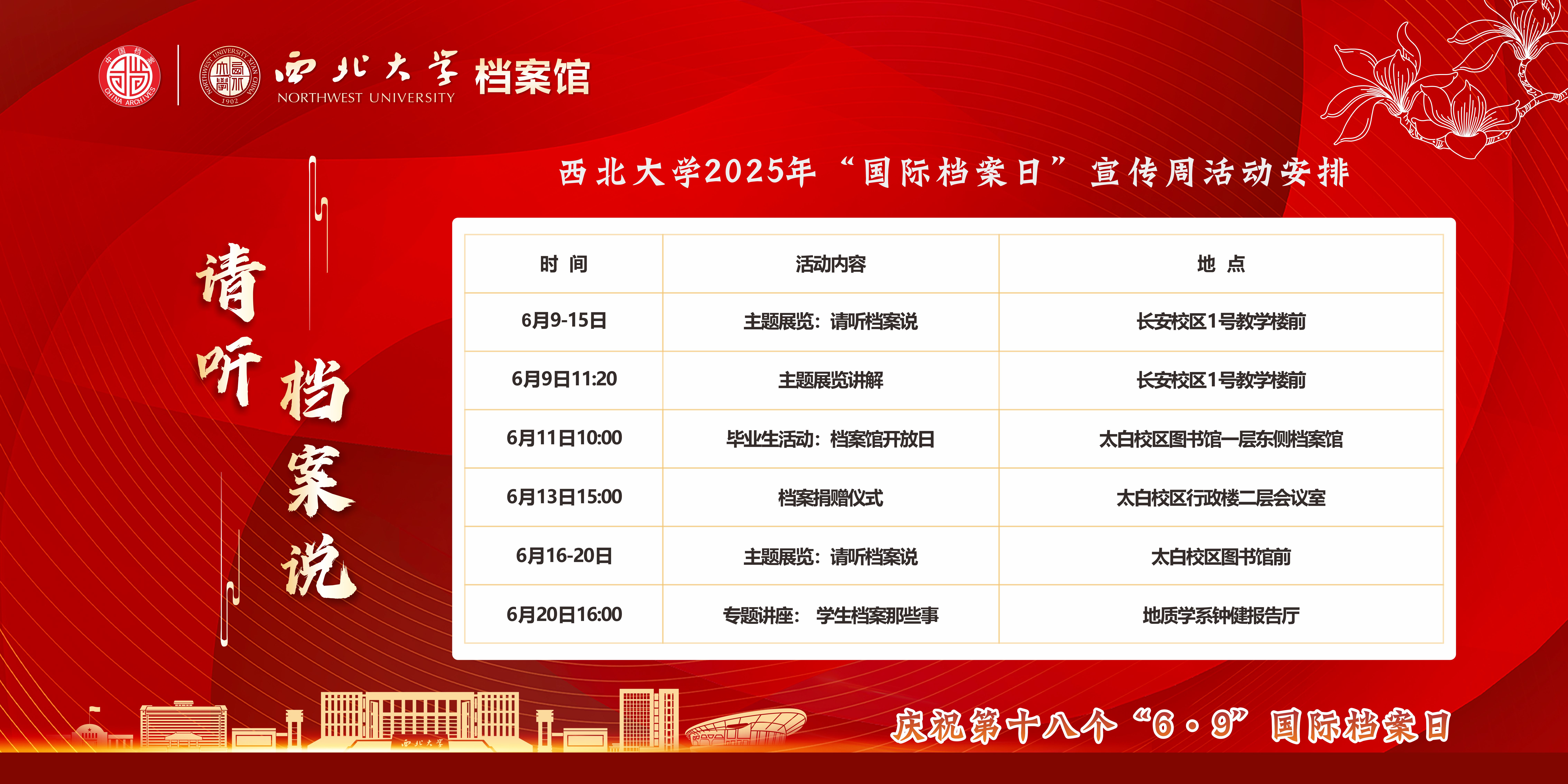根据2025年全国档案宣传工作要点以及国际档案日系列宣传活动安排,为进一步展现档案工作价值,增强师生档案意识,充分发挥档案存史资政育人的作用,学校举办主题为“请听档案说”的国际档案日宣传周活动。具体活动安排如下,欢迎广大师生参加!