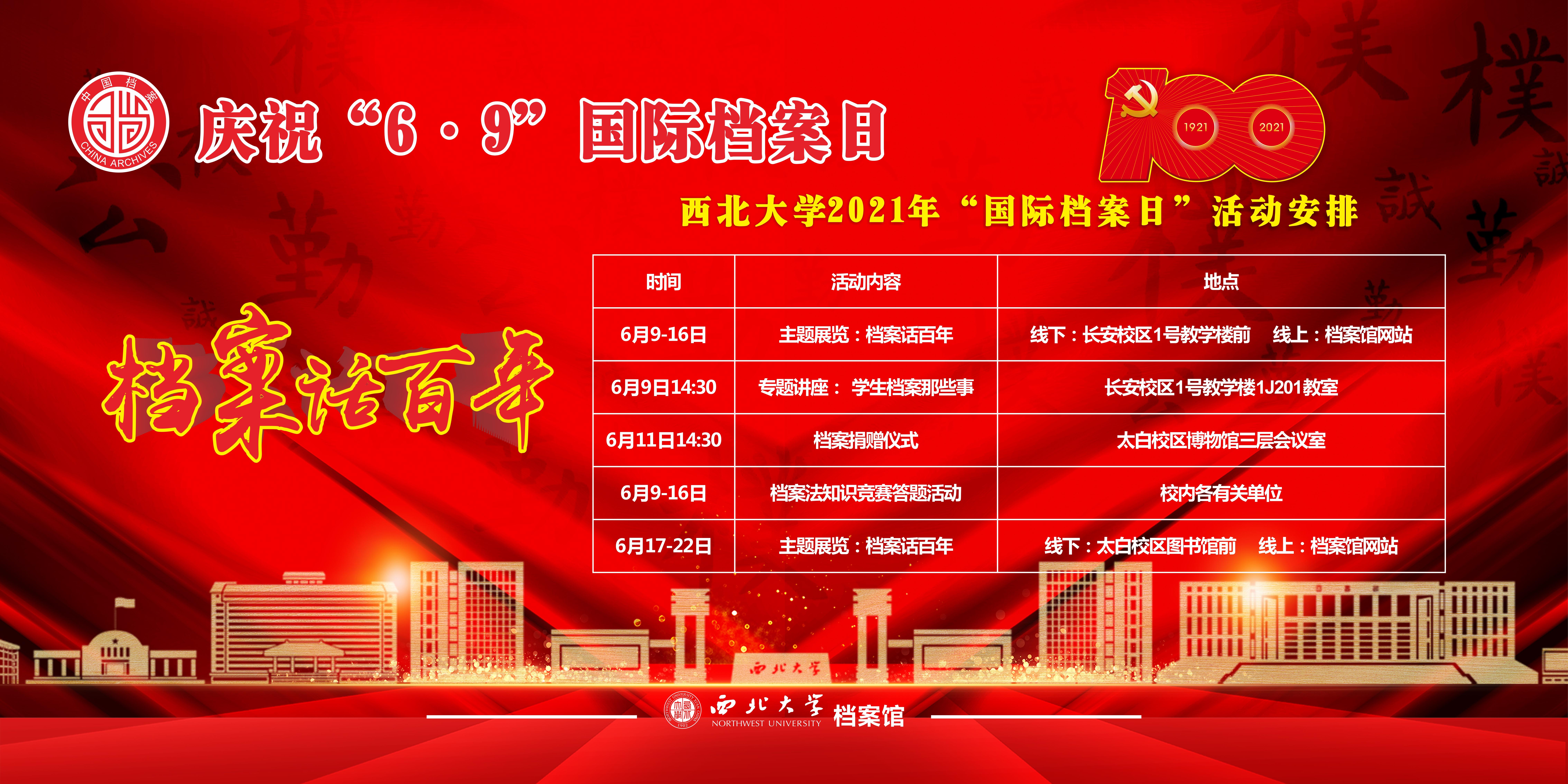 为庆祝中国共产党成立100周年,宣传贯彻落实新修订的《中华人民共和国档案法》,不断增强全校师生档案意识,助力学校“双一流”建设,积极发挥档案工作“记载历史、传承文明、服务未来”的作用和档案“存凭、留史、资政、育人”的功能,讲好“西大故事”,根据国家档案局《2021年全国档案宣传工作要点》等有关精神,学校举办第七届以“档案话百年”为主题的国际档案日系列宣传活动。具体活动安排如下,欢迎广大师生踊跃参加!