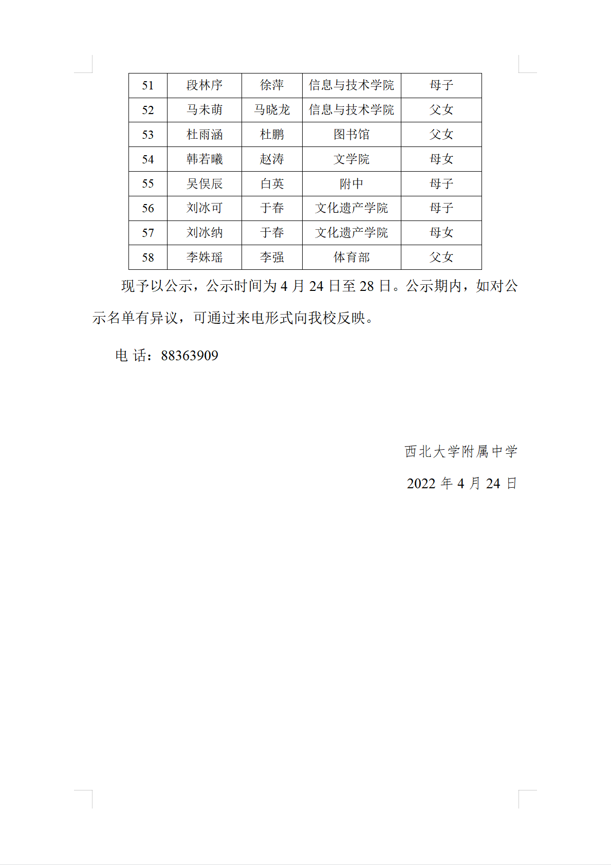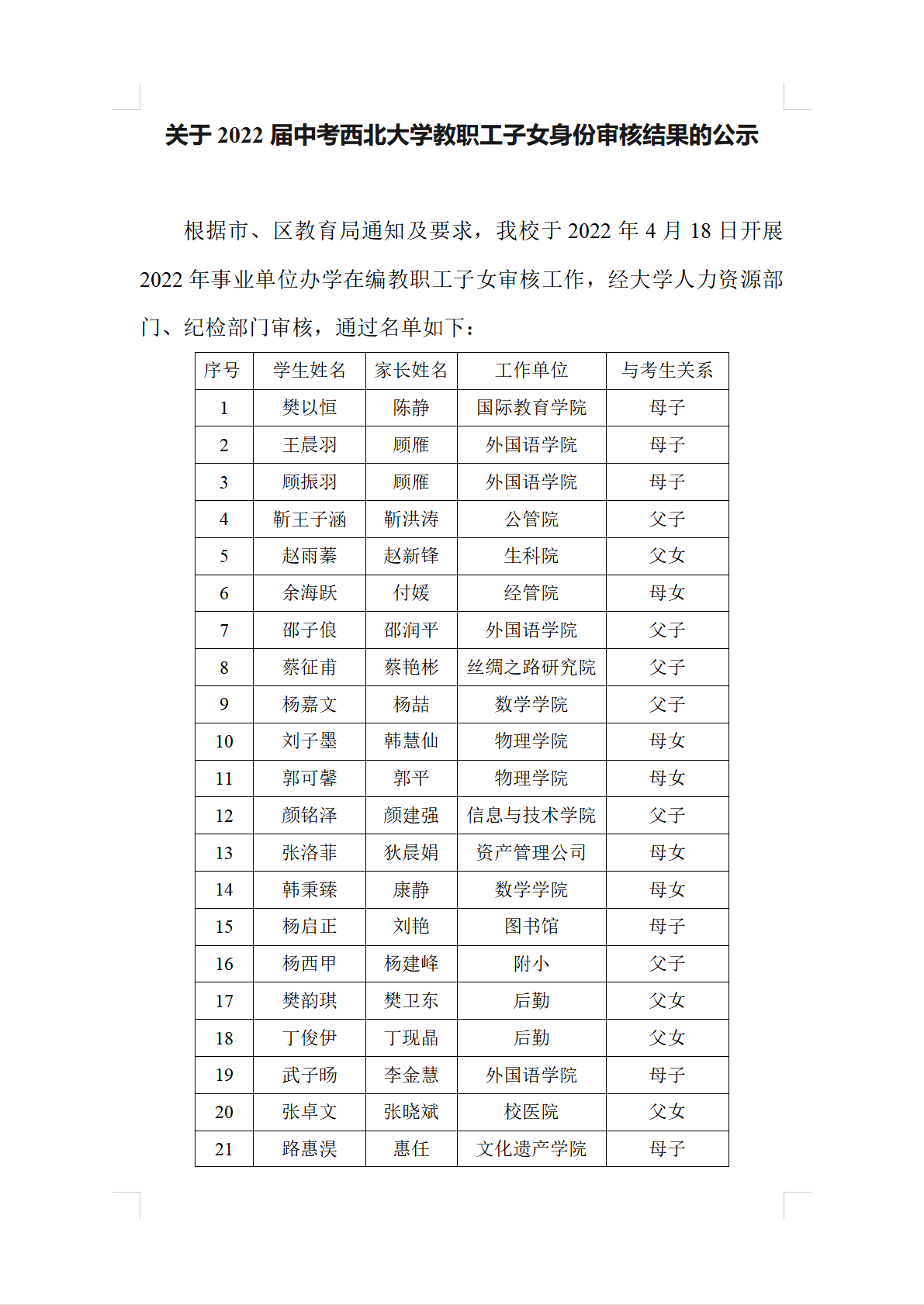关于2022届中考beat365唯一官网教职工子女身份审核结果的公示