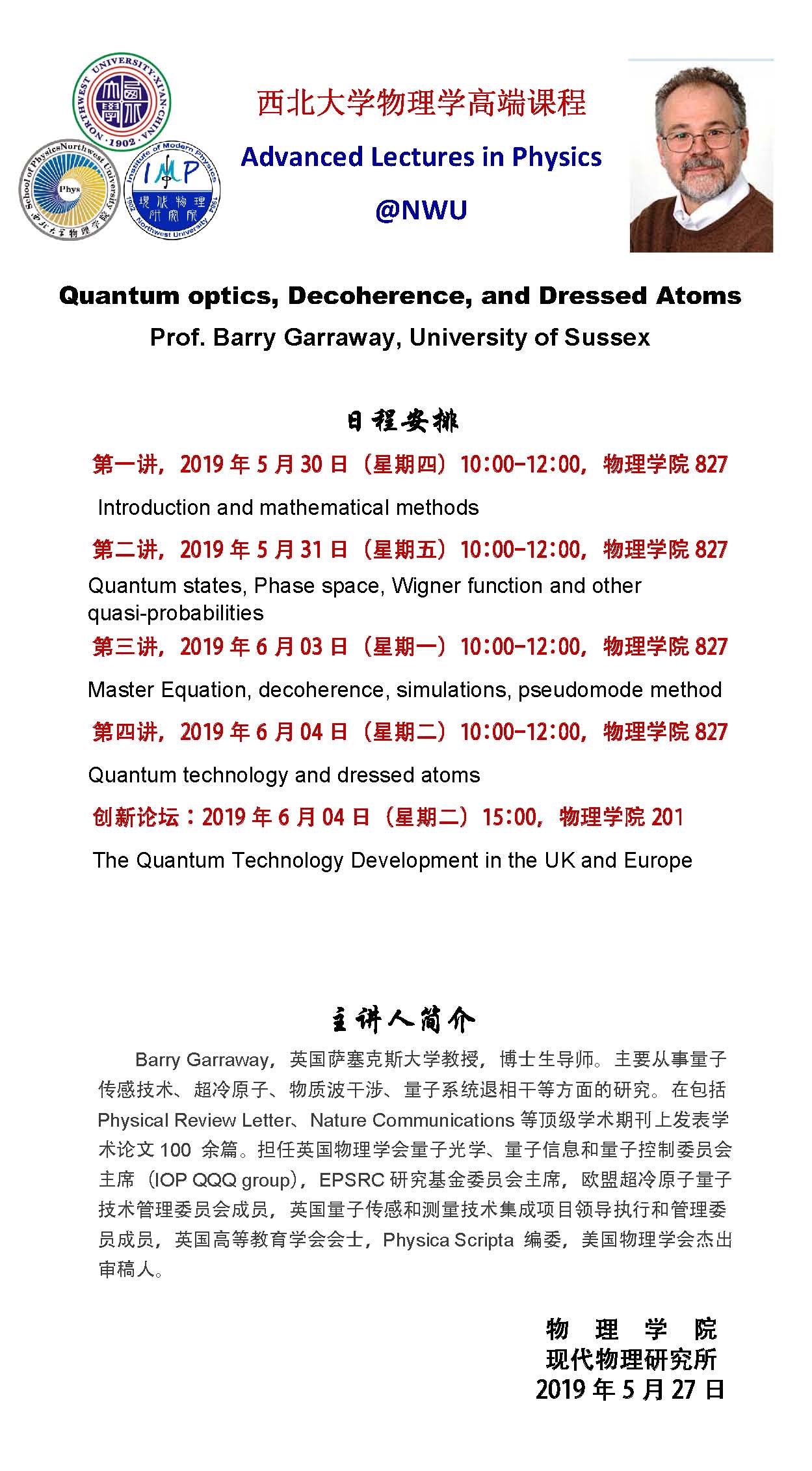beat365唯一官网物理学高端课程--Quantum optics, Decoherence, and Dressed Atoms